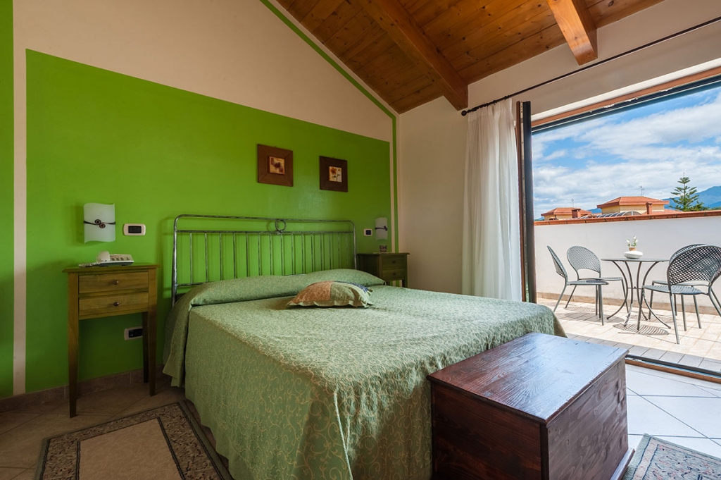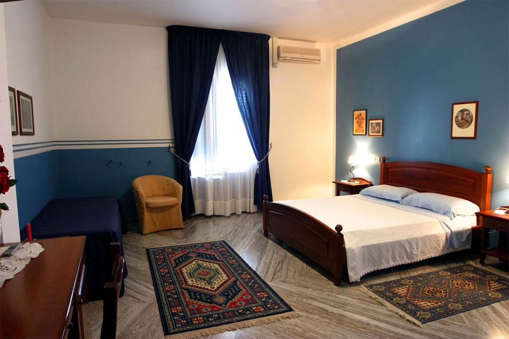 Camera ideale per i nuclei familiari, con letto matrimoniale, letti singoli e culla per i neonati.